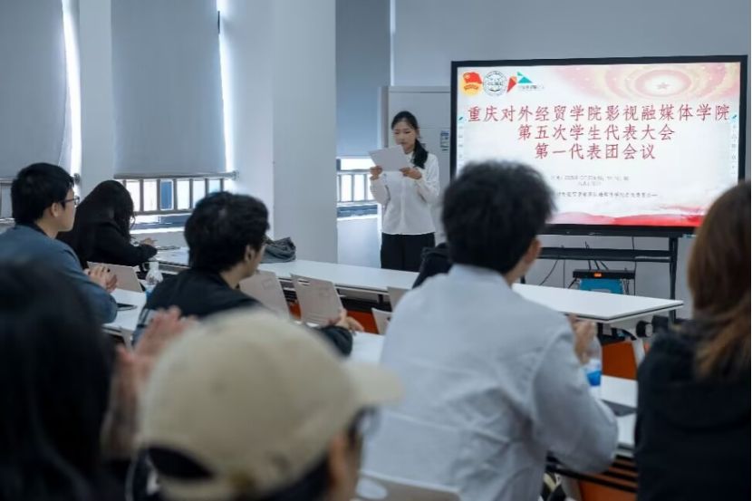 为进一步发扬校园民主,畅通沟通渠道,凝聚青年力量,服务同学成长,重庆对外经贸学院影视融媒体学院于10月30日在合川A校区学术报告厅9101隆重召开第五次学生代表大会。学院领导、嘉宾及学生代表齐聚一堂,共商学生工作发展大计。