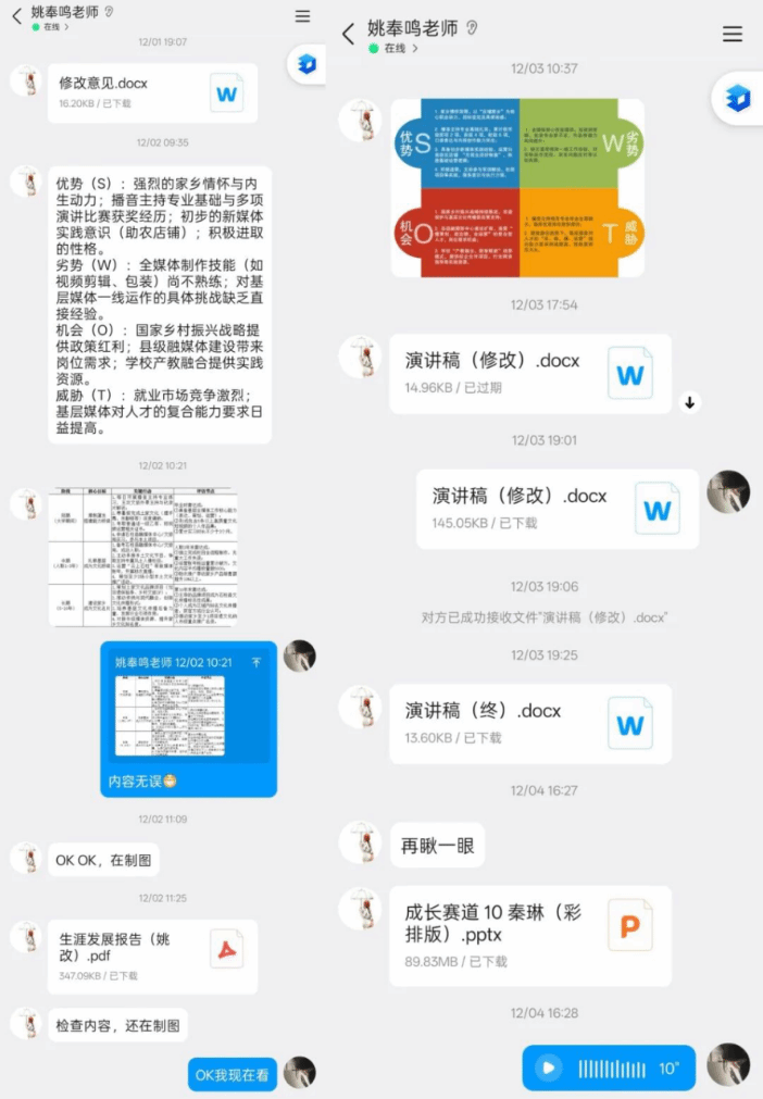 指导教师姚奉鸣更是全程“保驾护航”的关键力量。姚老师从职业目标定位,规划书、演讲稿撰写梳理,到答辩技巧提升、心态调整等方面都给予秦琳针对性极强的指导。复赛阶段,姚老师逐字逐句修改规划书,帮她理清职业发展路径中的逻辑漏洞;决赛前夕,多次组织模拟答辩,指出她的表达短板并给出改进建议,陪着她一起打磨每一个答辩细节。