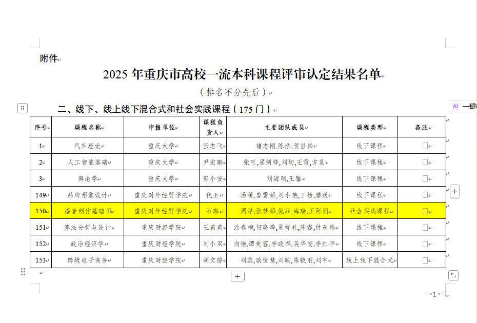 近日,2025年重庆市高校一流本科课程评审结果揭晓,学院教师团队的《播音创作基础Ⅱ》课程成功获批重庆市高校一流本科课程(社会实践课程类)。该课程由石琳老师担任课程负责人,主要团队成员包括周洋、张梦娇、倪菲、海瑞及行业
