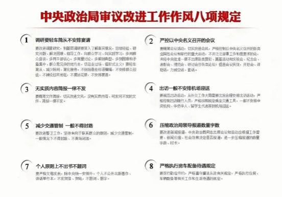 2012年12月4日,中共中央政治局召开会议,审议通过了《中央政治局关于改进工作作风、密切联系群众的八项规定》,因为其主要内容有八条,所以简称“中央八项规定”或“八项规定”。该规定以政治局为表率,以上率下。其主要内容是: