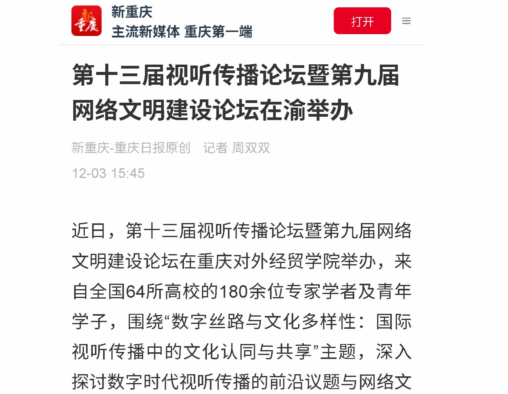 上一条:重庆第一眼新闻报道:第十三届视听传播论坛暨第九届网络文明建设论坛在重庆对外经贸学院举办 下一条:华龙网报道:聚焦数字文明与文化互鉴 共探国际视听传播新趋势:第十三届视听传播论坛暨第九届网络文明建设论坛在重庆对外经贸学院举办