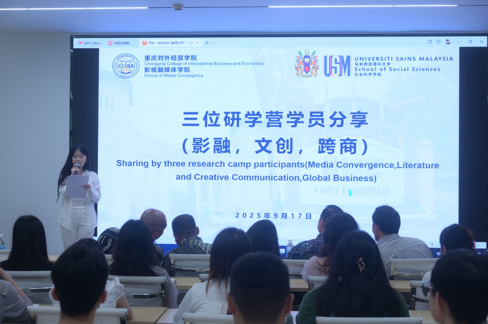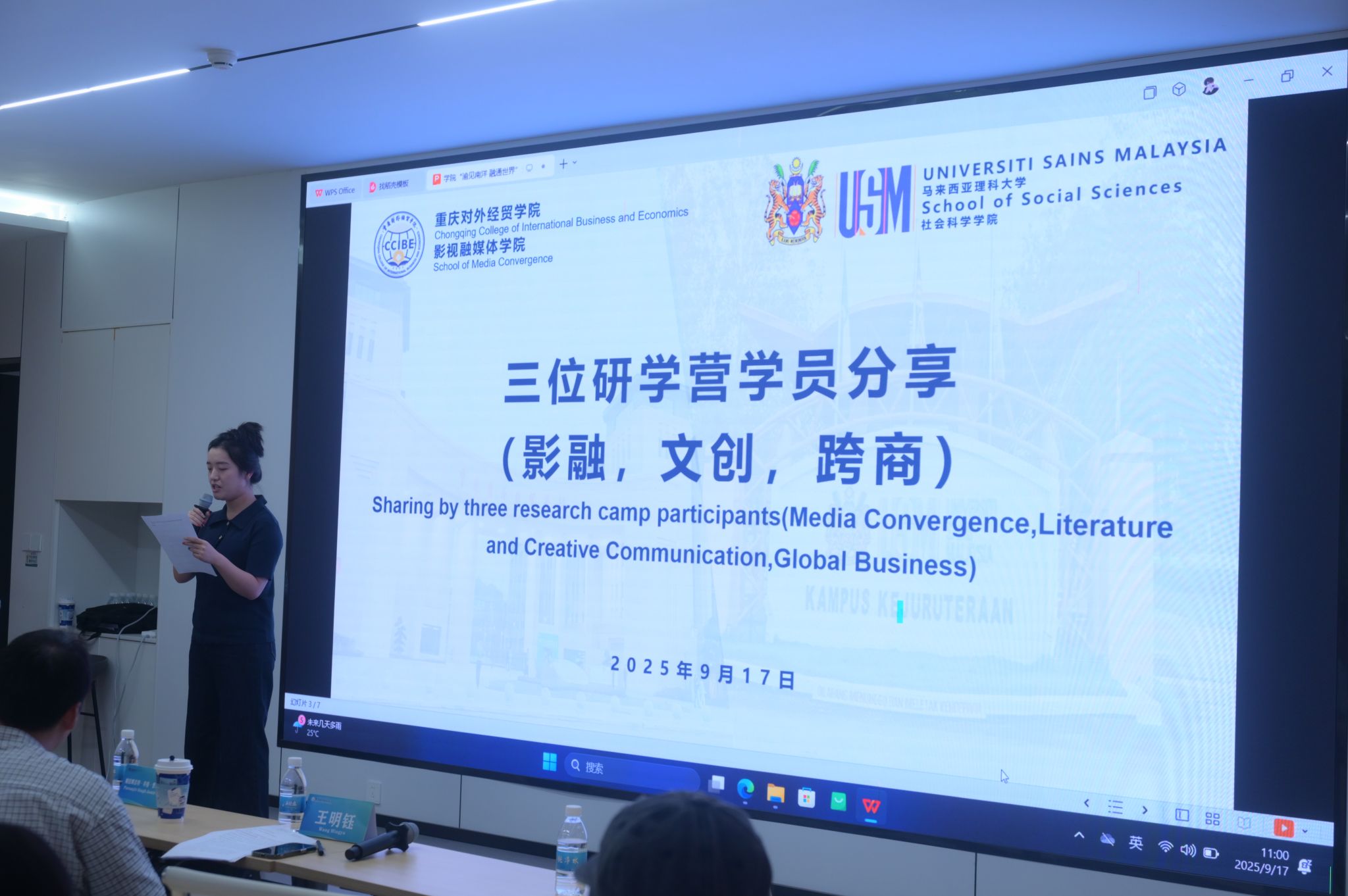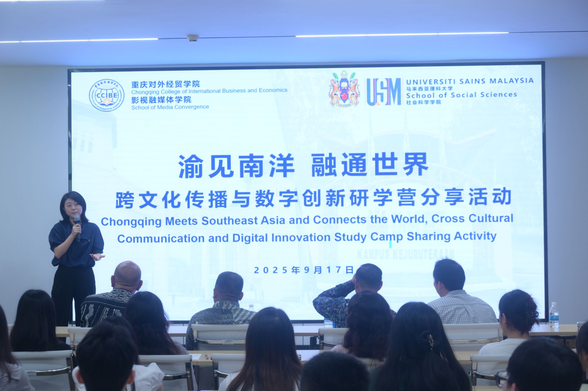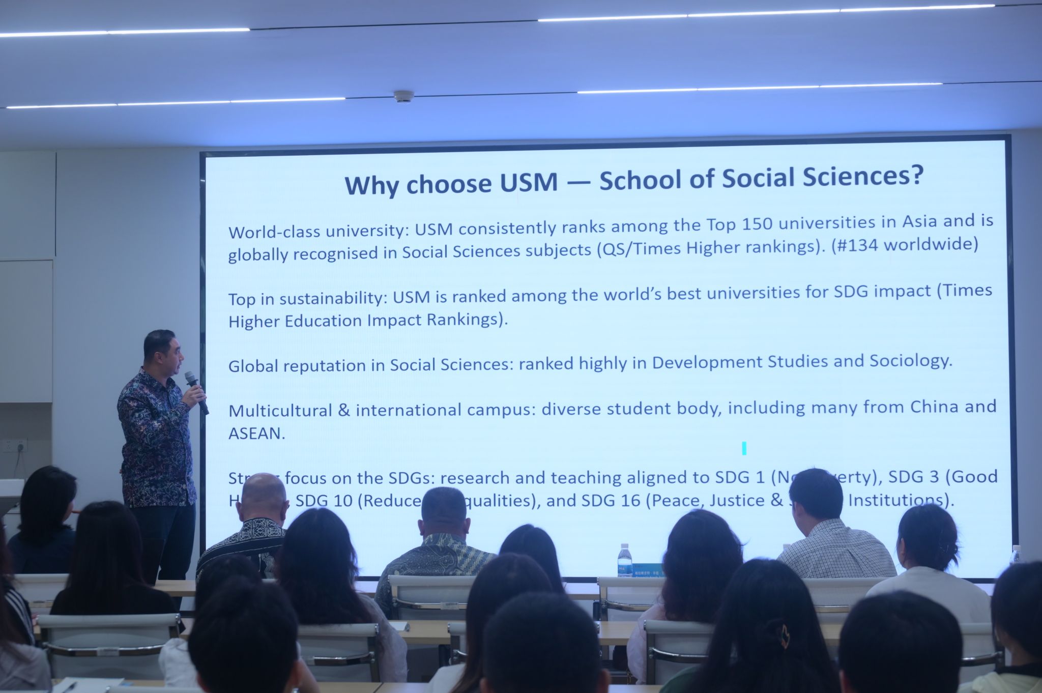 为拓展学子的国际化视野,深化跨文化传播与数字创新教育实践,学院于8月下旬与马来西亚理科大学社会科学学院深度合作,联合学校国际交流处,组织了13名师生赴马来西亚开展“跨文化传播与数字创新研学营”。为充分总结研学成果、促进经验共享,学院于9月17日上午在9418会议室举办了交流分享会。马来西亚理科大学社会科学学院院长莫哈末沙哈鲁丁·桑苏里詹、副院长帕拉姆吉特·辛格·贾米尔辛格、博士生导师庄坚祥博士,以及学院常务副院长王杨丽共同出席分享会。