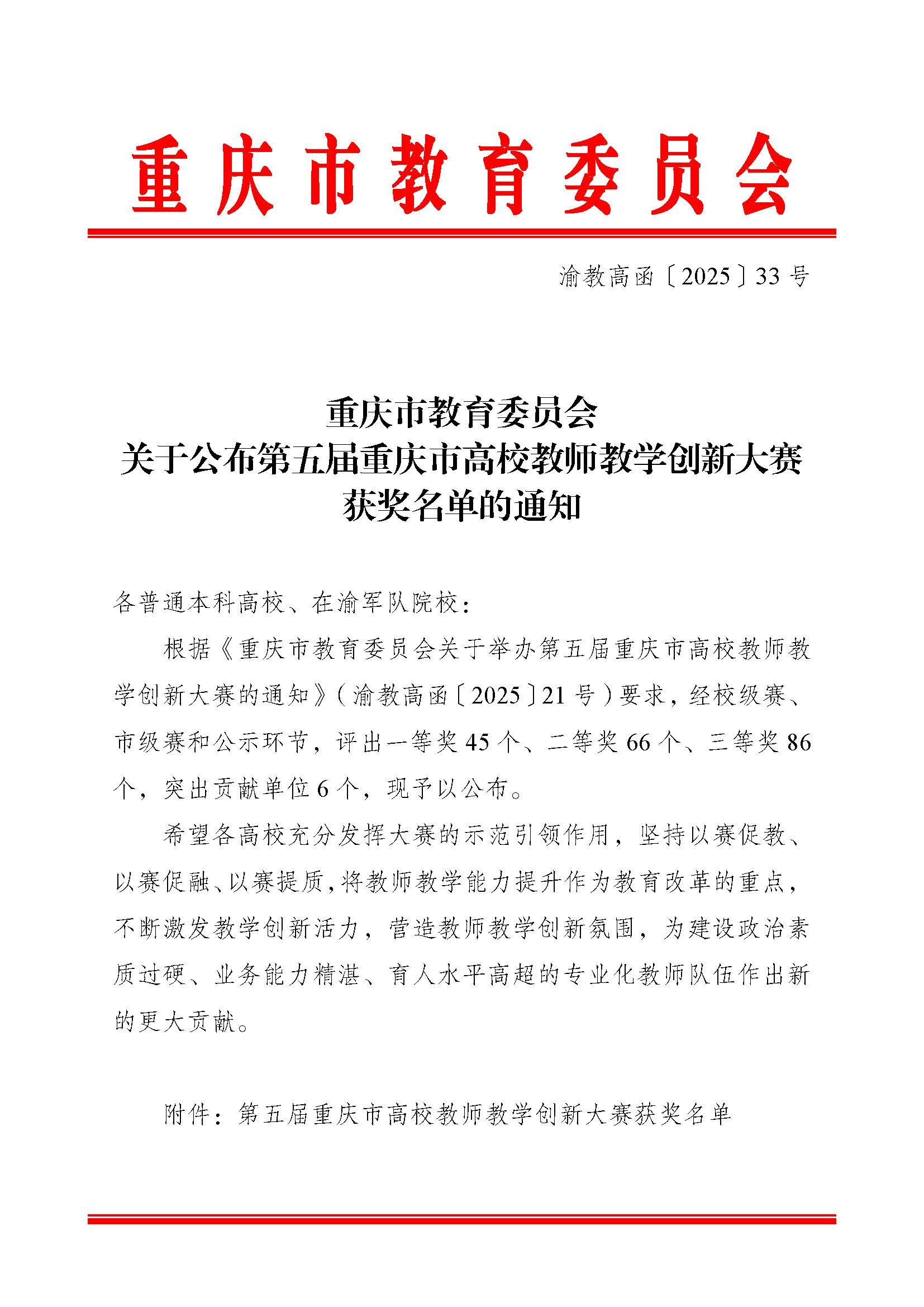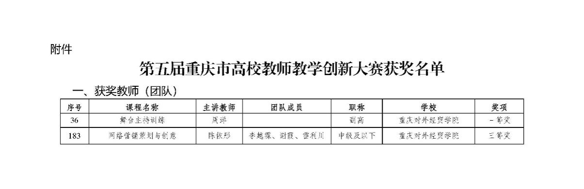 近日,重庆市教育委员会公布了第五届重庆市高校教师教学创新大赛获奖名单,我院教师在众多优秀选手中脱颖而出,斩获殊荣: