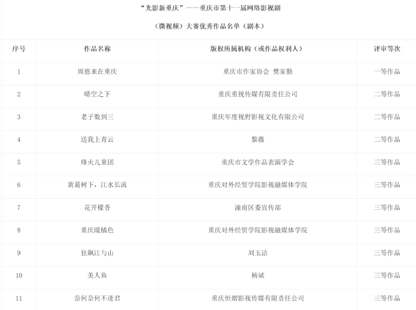 近日,由重庆市委宣传部、重庆市广电局联合发起的第十一届 “光影新重庆” 网络影视剧(微视频)大赛获奖名单正式揭晓,我院《黄葛树下,江水长流》《重庆暖橘色》两部作品荣获大赛剧本单元三等奖,学院获评“优秀组织奖”。