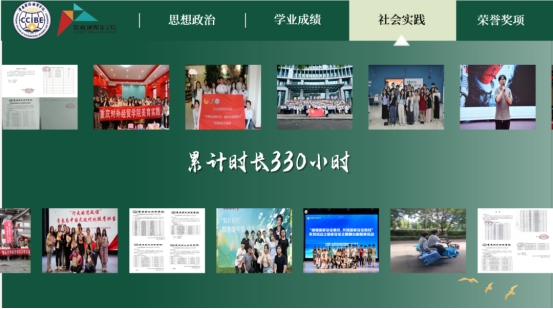 在校期间荣获国家励志奖学金、学校奖学金和学业优秀奖学金等12项奖项,组织、参与校内校外活动和比赛76余次;累计工时330小时。曾参与2024年度“光影风华”系列活动之广播电视编导专业年度视听作品交流展;2024年大学生新文科实践创新大赛;2024年暑期“三下乡”社会实践活动;第十四届”挑战杯“中国大学生创业计划竞赛;“中国高校影视学会网络视听专业委员会第三届理事会成立大会暨第六届中国高校网络视听论坛”;“‘增强国家安全意识,共筑国家安全防线’系列活动之国家安全主题舞台剧展演比赛决赛”;第三届“教学相长杯”思政主题教育示范课比赛;首届大学生职业规划大赛;第十六届全国大学生广告艺术大赛等活动和比赛。已考取高校心理委员工作平台MOOC培训合格证书。