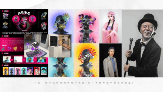 在院长工作室任职期间出色完成第二届“预渲染”数字艺术周戏剧影视美术设计专业展位策划、设计工作,AR交互虚拟时尚设计作品《赤骨丰花》也在该展发布展出。同时,还连续参与表演专业毕业大戏等学院妆造工作。