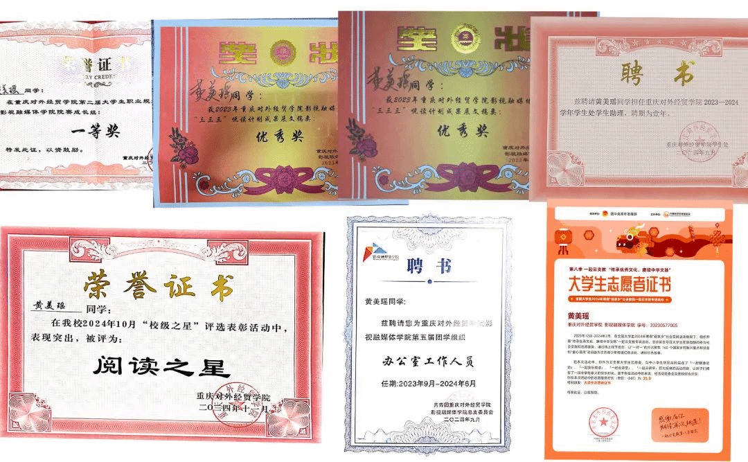 在参与校园活动方面,黄美瑶表现十分活跃。在 “影视融媒体学院第三次学生代表大会” 上,作为学生代表团第二代表团副团长,她认真履行职责,积极收集同学们的意见和建议,并在会议上充分表达,为学院发展建言献策。在 “2024 年第十二届辅导员素质能力大赛” 中,她既是活动工作人员,又是赛事准备人员,从前期策划到现场执行,每一个环节都能看到她忙碌的身影,为大赛的顺利举办贡献了自己的力量。此外,她还参与了影视融媒体学院志愿服务系列活动,在 “我为群众办实事活动” 中,主动为同学们解决生活和学习中的困难,用实际行动诠释奉献精神。