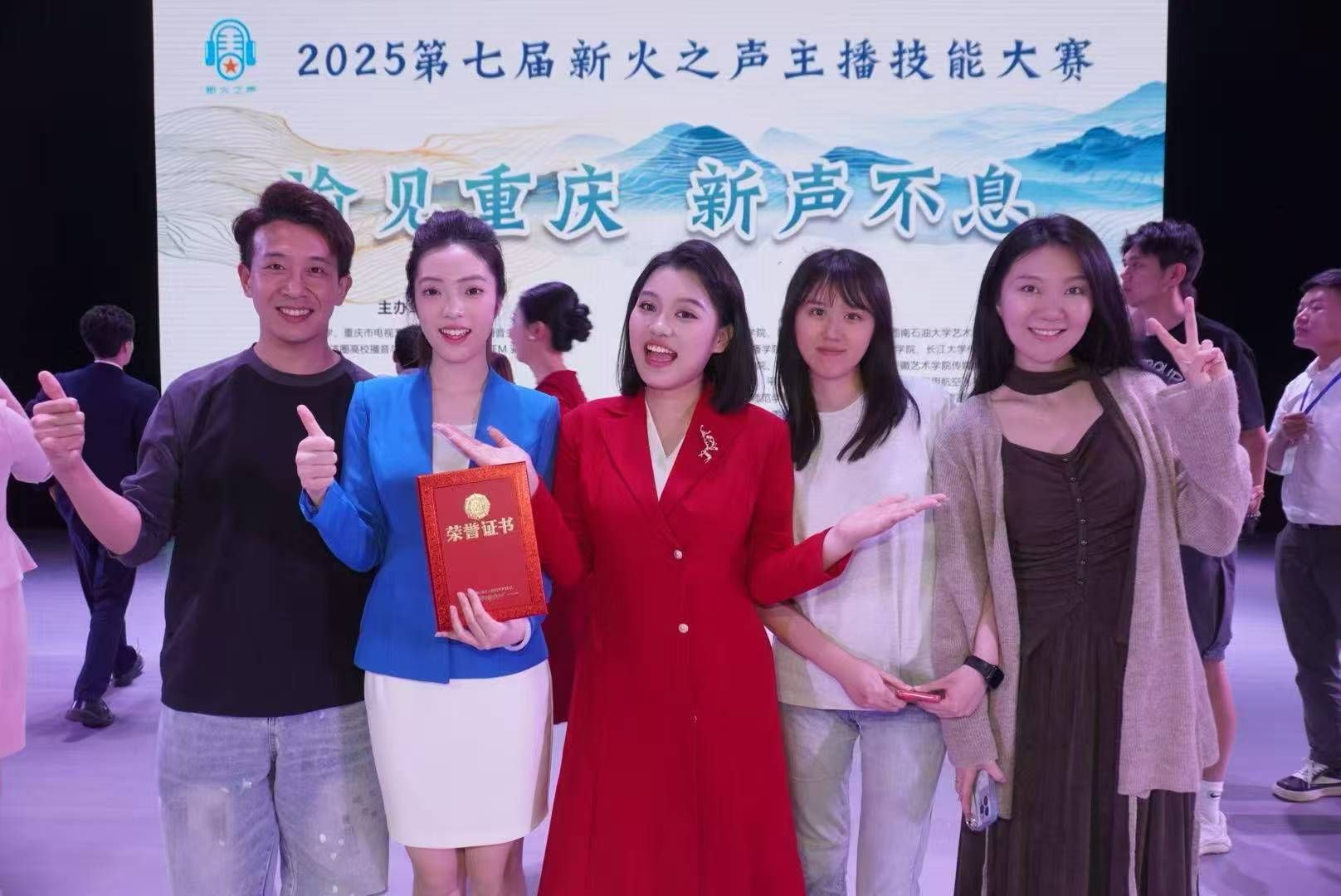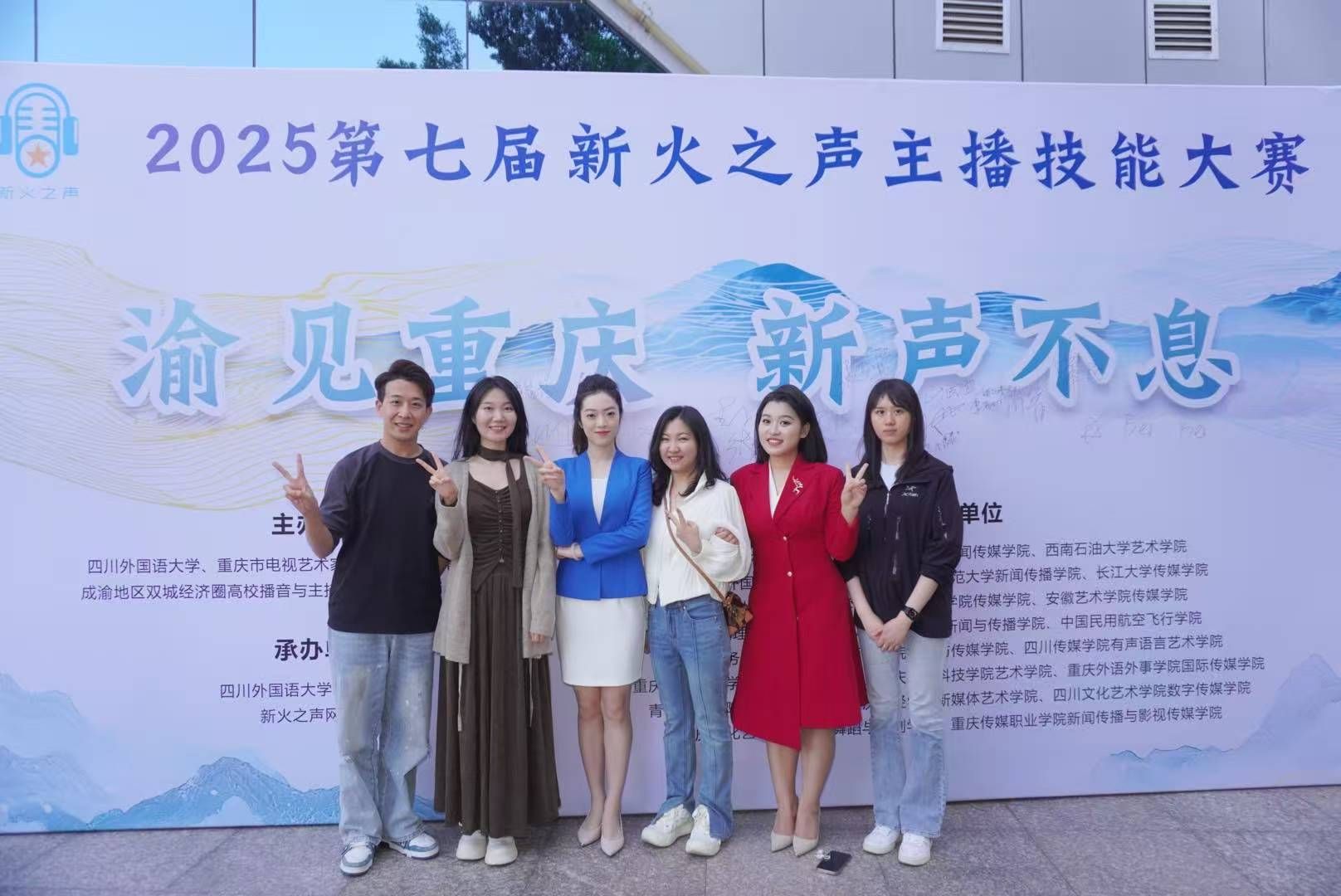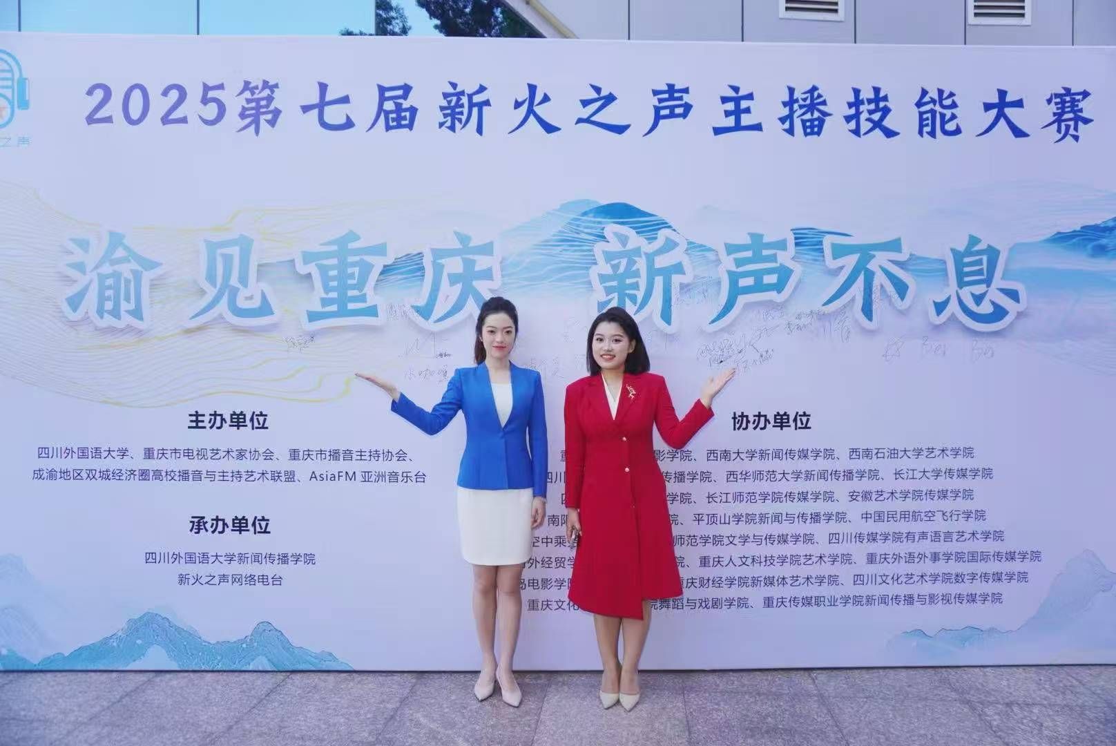 本届新火之声主播技能大赛全国总决赛于2025年5月10日下午2点在四川外国语大学火热开赛。学院2022级播音与主持艺术学子余若、秦夕茹在该项比赛海选的400部作品中脱颖而出晋级到全国总决赛。在5月10日总决赛中余若、秦夕茹在周洋、付麟雅老师的辅导下一路过关斩,最终获得本届比赛的二等奖和最佳媒体风尚奖!
