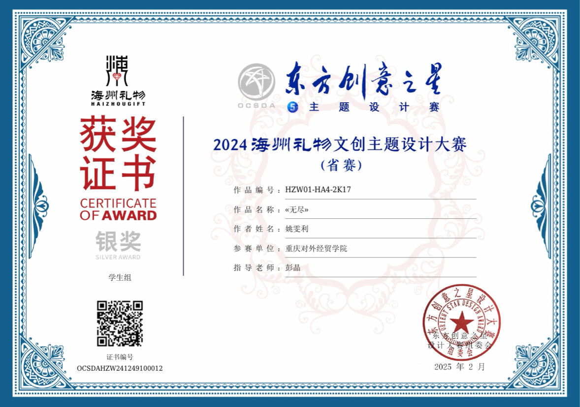 姚雯利在专业学习上始终保持着高度的热情和专注。她的努力得到了丰硕的回报:2023年12月,她荣获“国青杯”全国高校艺术设计作品展评二等奖;2024年12月,她再次斩获该奖项,展现了她在艺术设计领域的持续进步与实力。此外,她还凭借优异的成绩获得了2023-2024学年“学校奖学金”一等奖和“行知奖学金”一等奖,这些荣誉不仅是对她学术能力的肯定,更是她勤奋与智慧的见证。2025年2月,她在省级“东方创意之星”主题设计赛中摘得银奖,进一步彰显了她在艺术设计上的独特视角和创新能力。