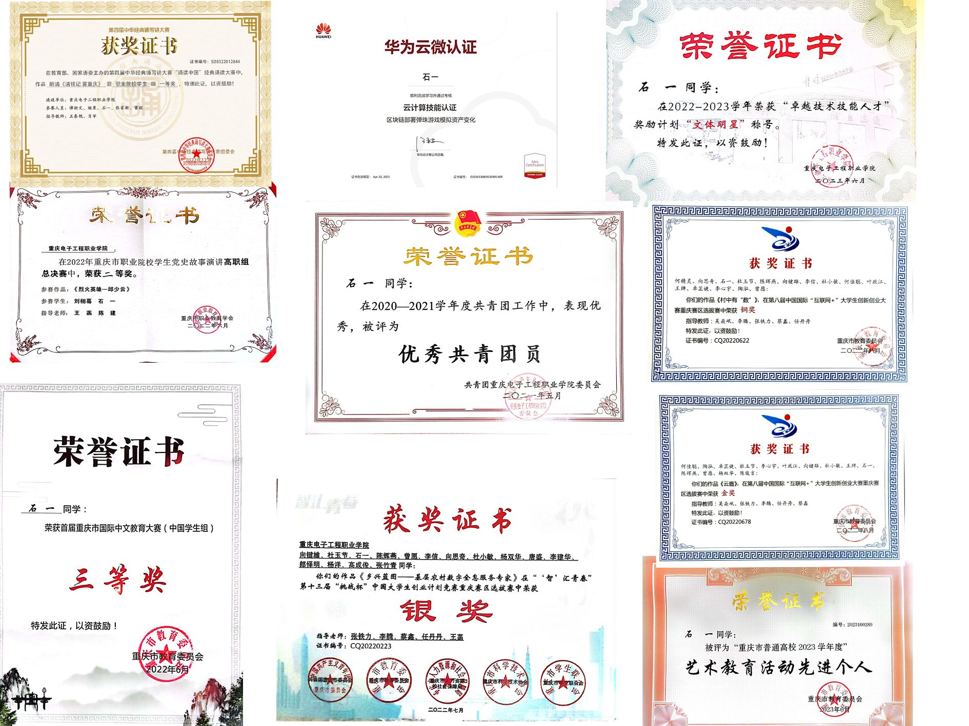 早在专科阶段,石一便以“夯实基础、以实践验真章”为求学准则。数字媒体技术专业的学习中,他不仅吃透课堂理论,更主动深耕技术实操——在华为云平台系统钻研云计算技术,反复调试参数、打磨操作流程,最终顺利通过考核,拿下云计算技能认证与区块链部署相关证书;为将技术转化为实战能力,他投身各类竞赛,从第八届“互联网+”大学生创新创业大赛重庆赛区金奖(作品《云盾》)、铜奖(作品《村中有“数”》),到第十三届“挑战杯”中国大学生创业计划竞赛重庆赛区银奖(作品《乡兴蓝图》),再到第四届全国经典诵写讲大赛一等奖,一项项荣誉的背后,是他对“把每件事做到极致”的坚守。
