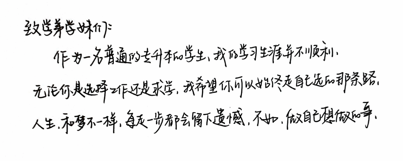 回望这段考研路,石一始终感恩那个“不肯放弃”的自己:“从数字媒体到经济管理,跨考的每一步都不容易,但正是这份挑战,让我看到了自己更多的可能。”如今,即将踏入西南大学的校园,他已开始规划未来的学习方向——将数字技术与经济管理知识结合,探索“数字经济赋能乡村振兴”的研究路径,让自己的研究生生涯更有价值。
