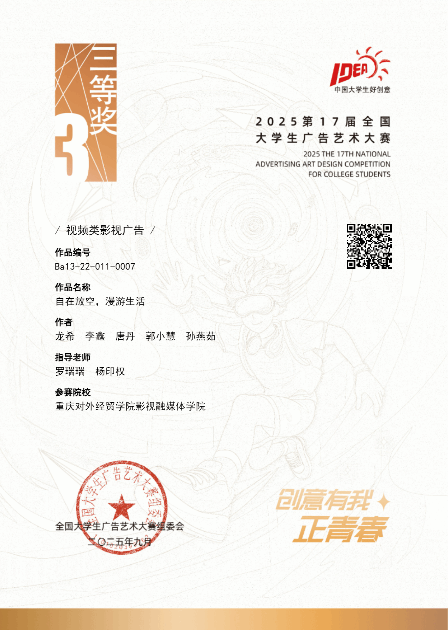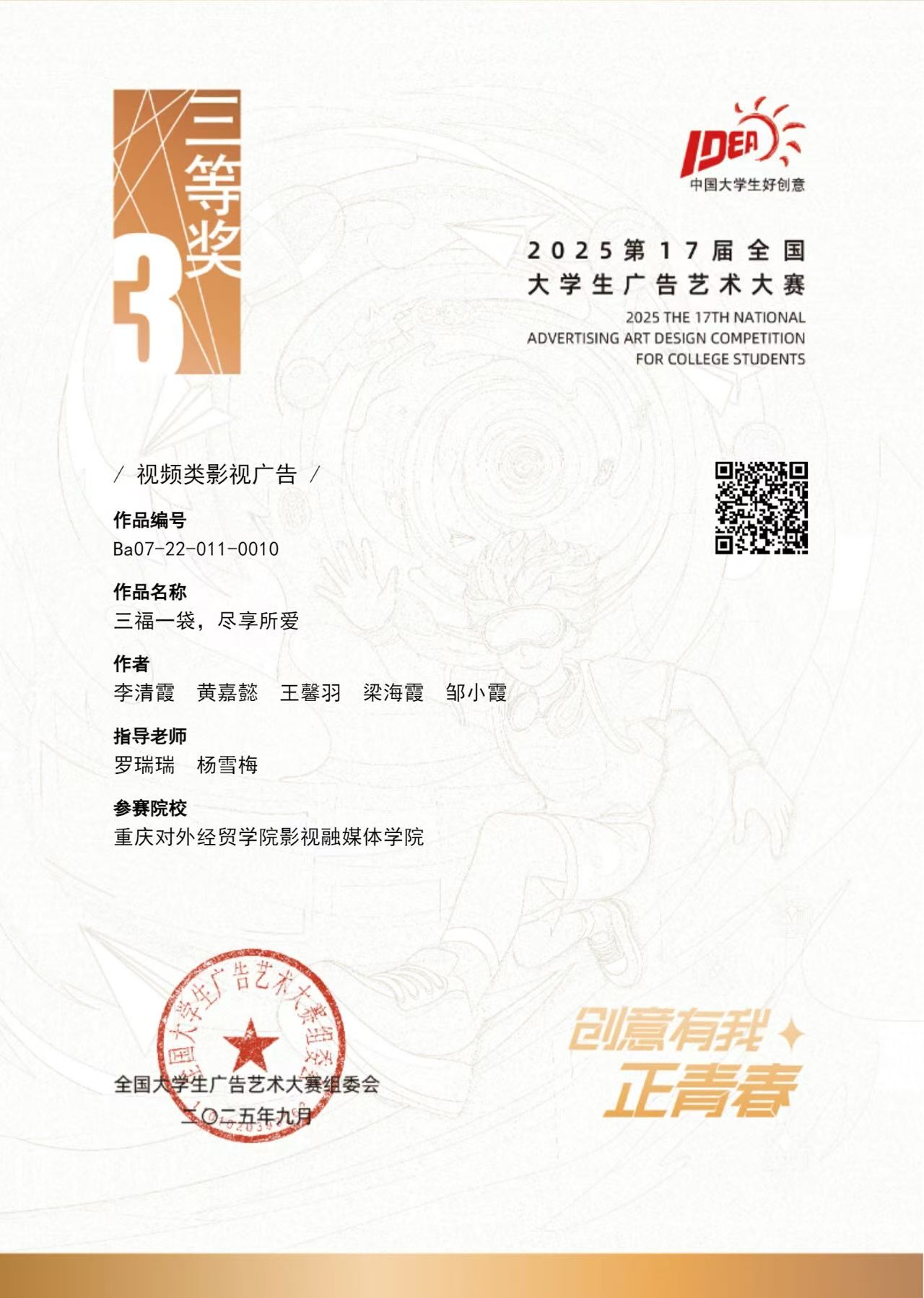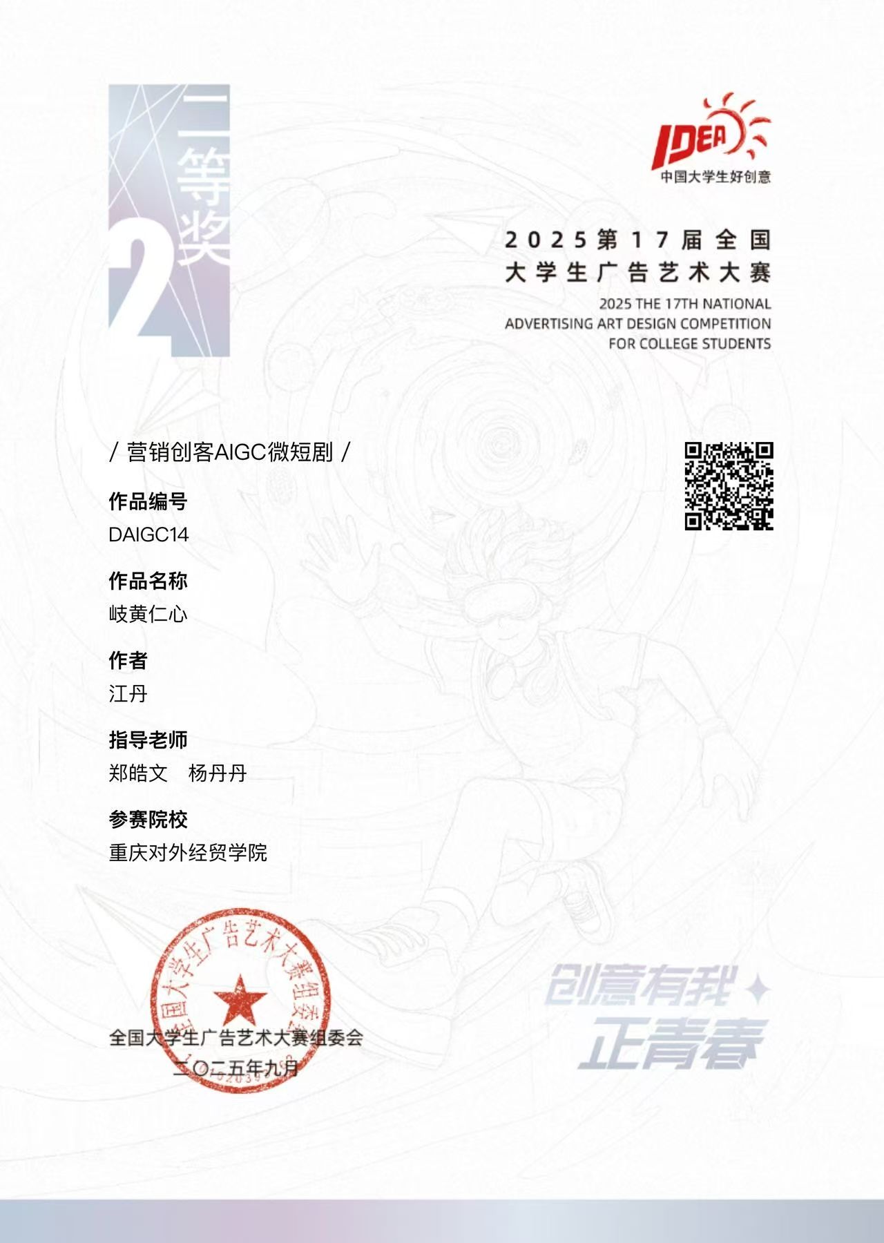 其中江丹同学的作品《岐黄仁心》获(营销创客赛道AIGC微短剧)国家级二等奖(指导老师:郑皓文、杨丹丹),龙希、李鑫、唐丹、郭小慧、孙燕茹的作品《自在放空,漫游生活》获(视频类影视广告)国家级三等奖(指导老师:罗瑞瑞、杨印权),李清霞、黄嘉懿、王馨羽、梁海霞、邹小霞同学的作品《三福一袋,尽享所爱》获(视频类影视广告)国家级三等奖(指导老师:罗瑞瑞 杨雪梅)。
