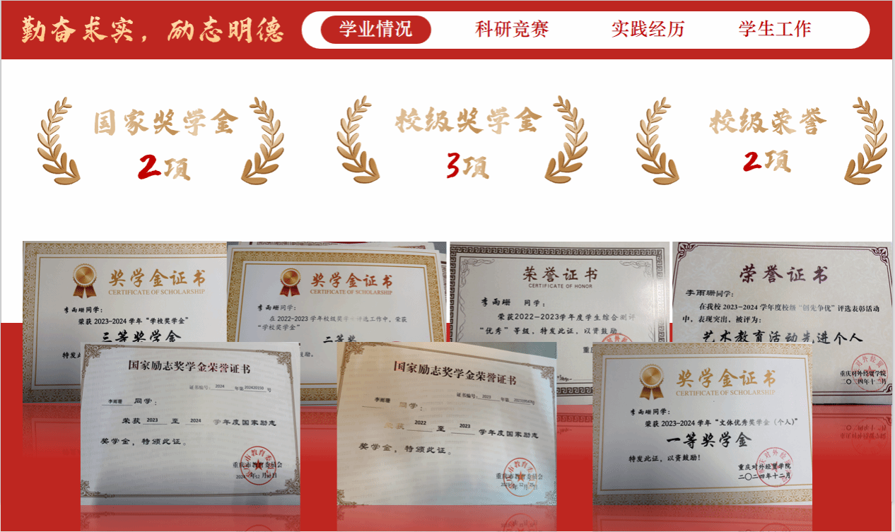 2024年12月获2023-2024学年“文体优秀奖学金(个人)”一等奖学金等。