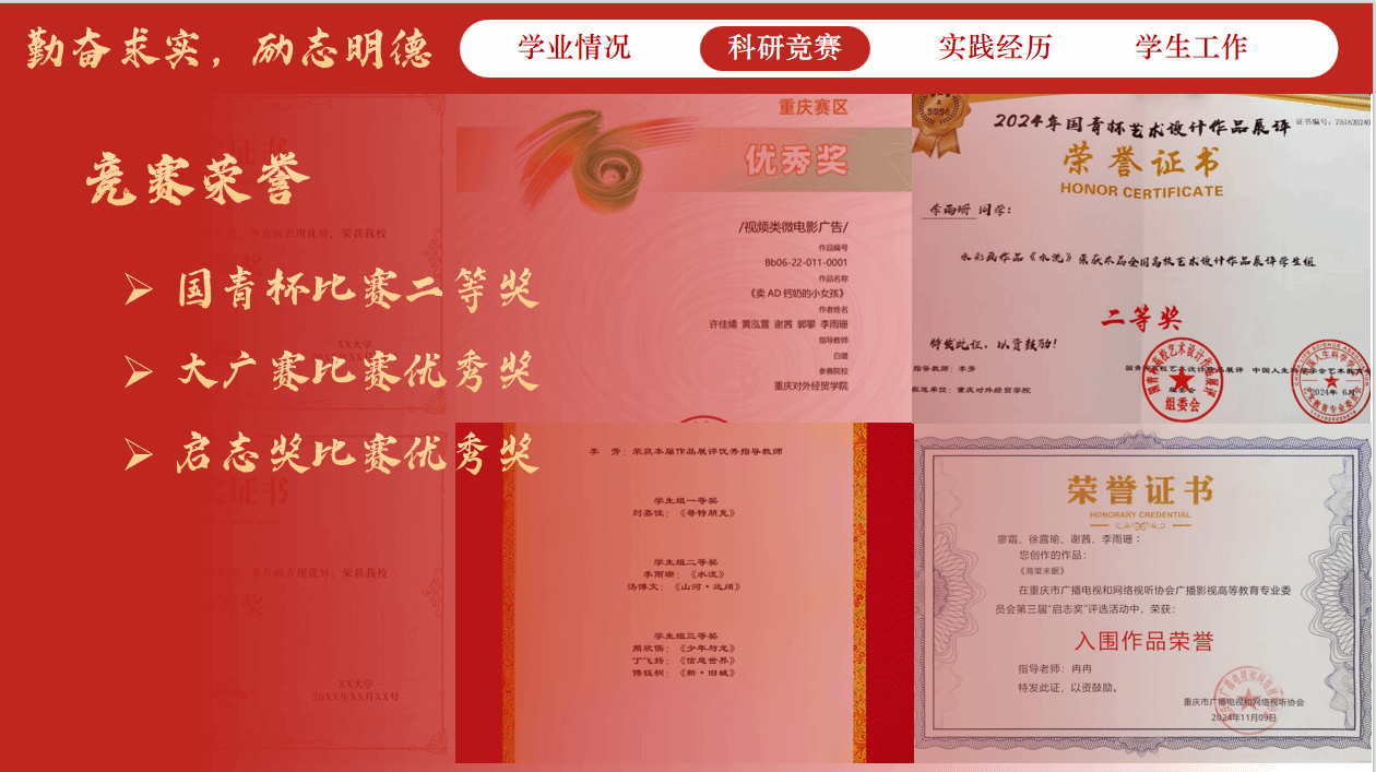 2022年12月,她的影评作品在重庆对外经贸学院“光影暖冬”影评比赛中荣获优秀奖,开启了竞赛征程;2023年12月,在“国青杯”全国高校艺术设计作品展评中斩获三等奖;2024年更是她的“竞赛丰收年”——3月,作品在“IP・创未来”2023重庆艺术版权季高校组动画视频类评选中获优秀版权奖;11月,原创微短剧剧本在重庆市广播和网络视听协会第三届“启志奖”评选中获优秀奖;12月,再度征战 “国青杯”,将全国高校艺术设计作品展评二等奖收入囊中。一项项荣誉的背后,是她对专业的热爱与执着,更是不断突破自我的勇气与毅力。