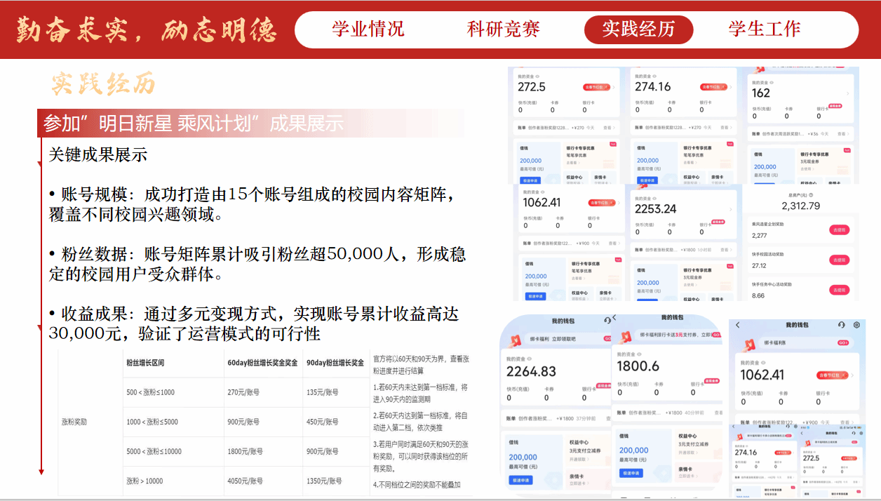 在融媒体运营领域,李雨珊更是展现出过人的创新意识与运营能力。作为核心成员参与“明日新星乘风计划”,她独立运营管理15个校园新媒体账号,构建覆盖不同校园兴趣领域的内容矩阵。通过精准定位受众、策划优质内容、优化运营策略,账号矩阵累计吸引粉丝超50000人,形成稳定的校园用户群体,更通过多元变现方式实现累计收益超 30000元,成功验证了运营模式的可行性。此外,她还在丰都融媒体中心担任实习编辑,负责官微等平台内容更新与策划,编写文案超80篇,将专业所学与地方传播需求紧密结合,展现了扎实的专业素养。