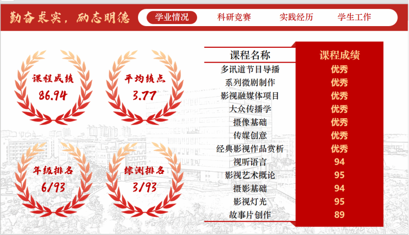 课后的李雨珊从未停下探索的脚步,她主动拓展学习边界,精读经典影视作品、研读行业前沿理论,不断充实知识储备;同时注重实操能力打磨,从剧本撰写、镜头运用到后期剪辑,每一项技能都反复练习、精益求精。这份执着与坚持换来了亮眼的成绩:本学年平均绩点3.77,年级排名稳居前6%,综测排名3/93,连续两年荣获校级奖学金,先后拿下国家励志奖学金、文体优秀一等奖学金等多项荣誉,用实力筑牢了专业根基。
