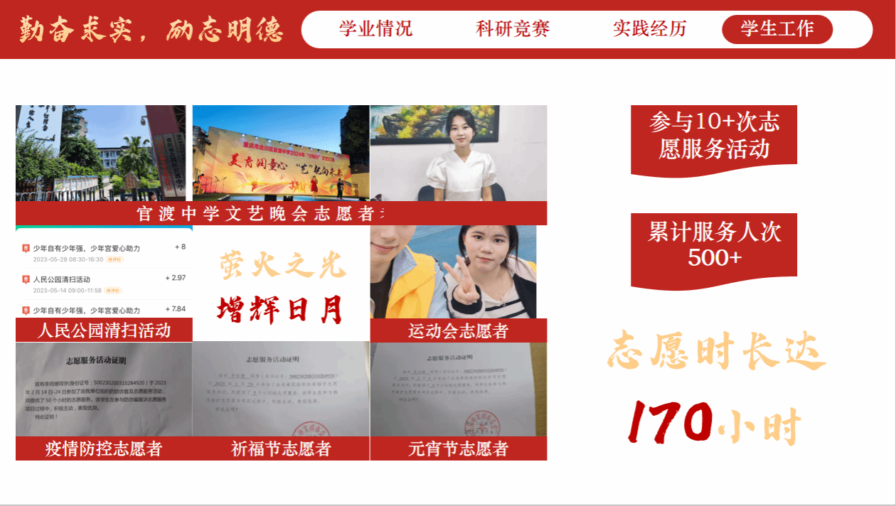 正如辅导员陈映衡老师评价:“该生在思想上积极进取,学业表现优异,专业基础扎实,成绩名列前茅。在科研与专业竞赛方面勇于探索,多次获得国家级、省级奖项,体现出较强的创新与实践能力。积极参与行业项目与专业实习,将理论运用于实践,展现了良好的专业素养与团队协作精神。作为学生骨干,工作认真负责,乐于服务同学,积极参与各类志愿服务活动,综合素质突出,是一名全面发展的优秀学生。”