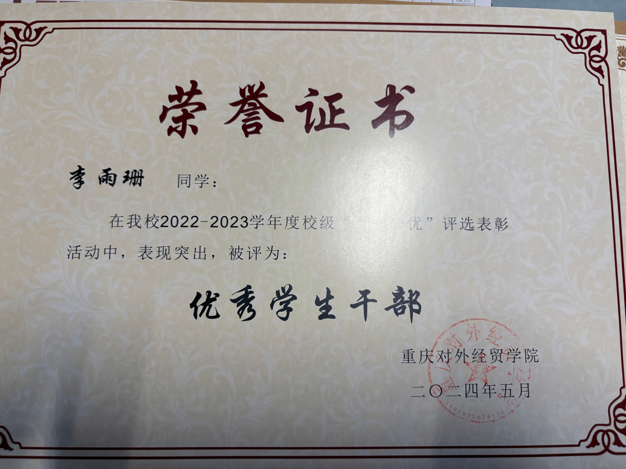 2024年5月2022-2023学年度校级“创先争优”评选表彰活动中表现突出被评为优秀学生干部;