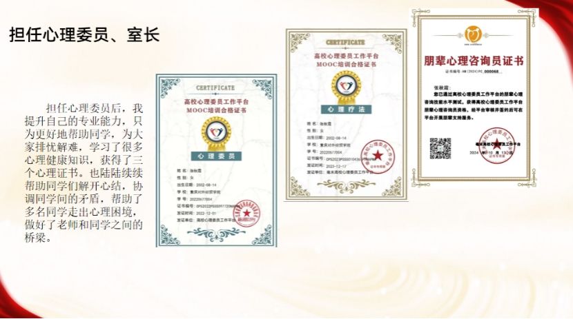 “作为心理委员,我想成为同学们的‘心灵树洞’与‘解忧桥梁’。”自大二学年起,张秋霞便担任班级心理委员,同时兼顾寝室长职责。为更好地服务同学,她主动学习心理健康知识,先后考取高校心理委员MOOC培训合格证书、朋辈心理咨询员证书、心理疗法相关证书,用专业能力为同学保驾护航。