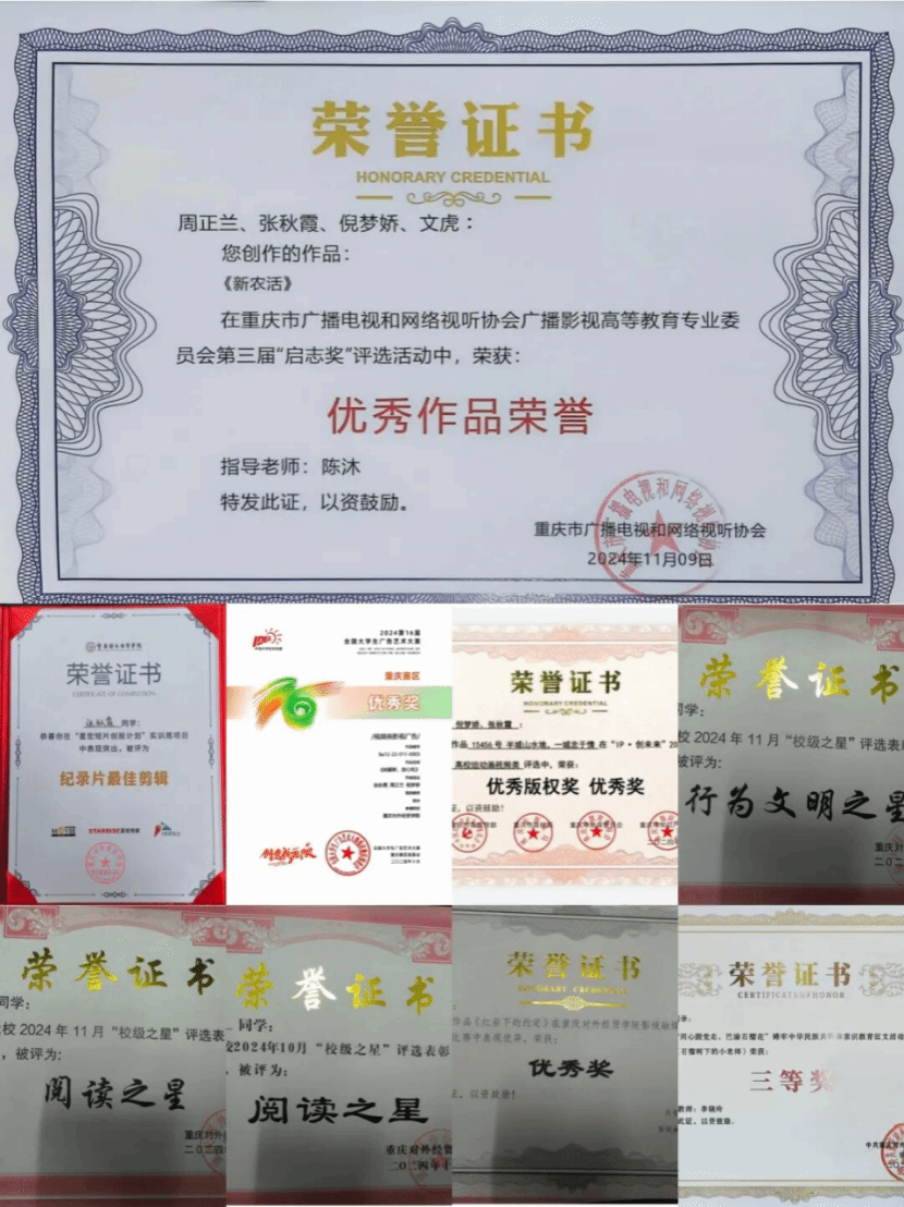 2024年11月荣获重庆市广播电视和网络视听协会广播影视高等教育专业委员会第三届“启志奖”评选活动优秀作品荣誉;