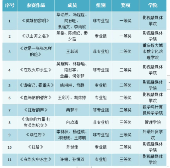 经过激烈的角逐,非专业组影视融媒体学院华浩然、冯程程等同学的作品《英雄的黎明》、专业组影视融媒体学院熊岳、陈妍妃等同学的作品《以山河之名》斩获一等奖。