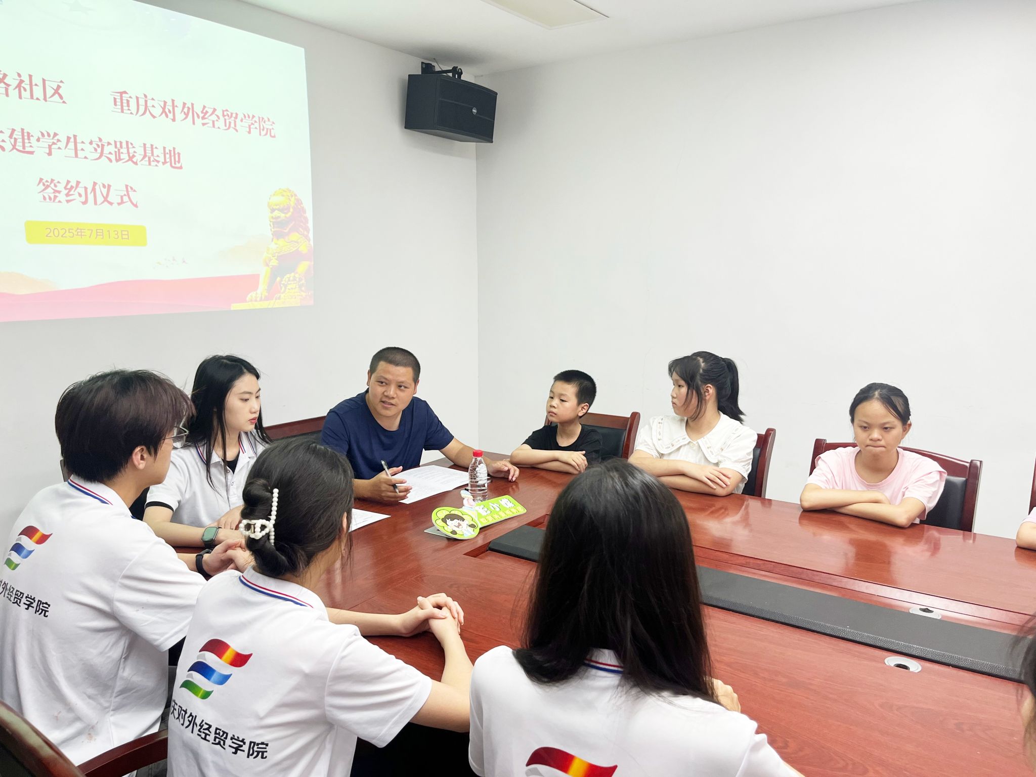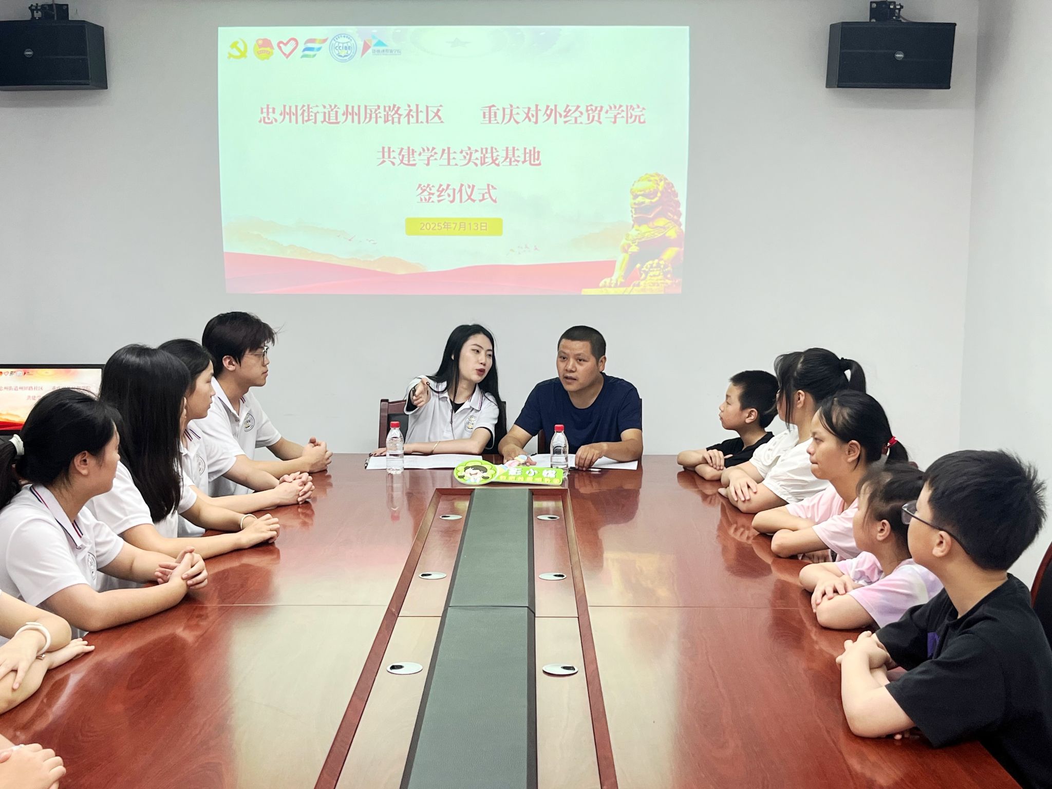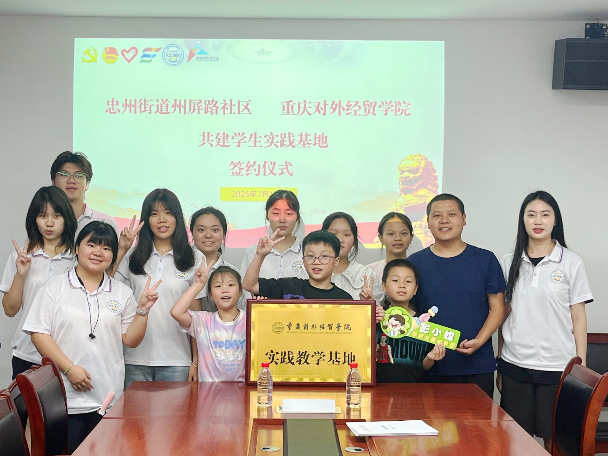 2025年7月13日,重庆对外经贸学院“影小媒”教育关爱服务团迈出深化校地合作、服务社区发展的坚实一步——与忠州街道州屏路社区居民委员会成功举行《实践教学基地协议书》签约仪式。服务团指导老师李苏带领团队成员,与州屏路社区党委书记伯金、社区暑期托管班小朋友共同见证了这一重要时刻。