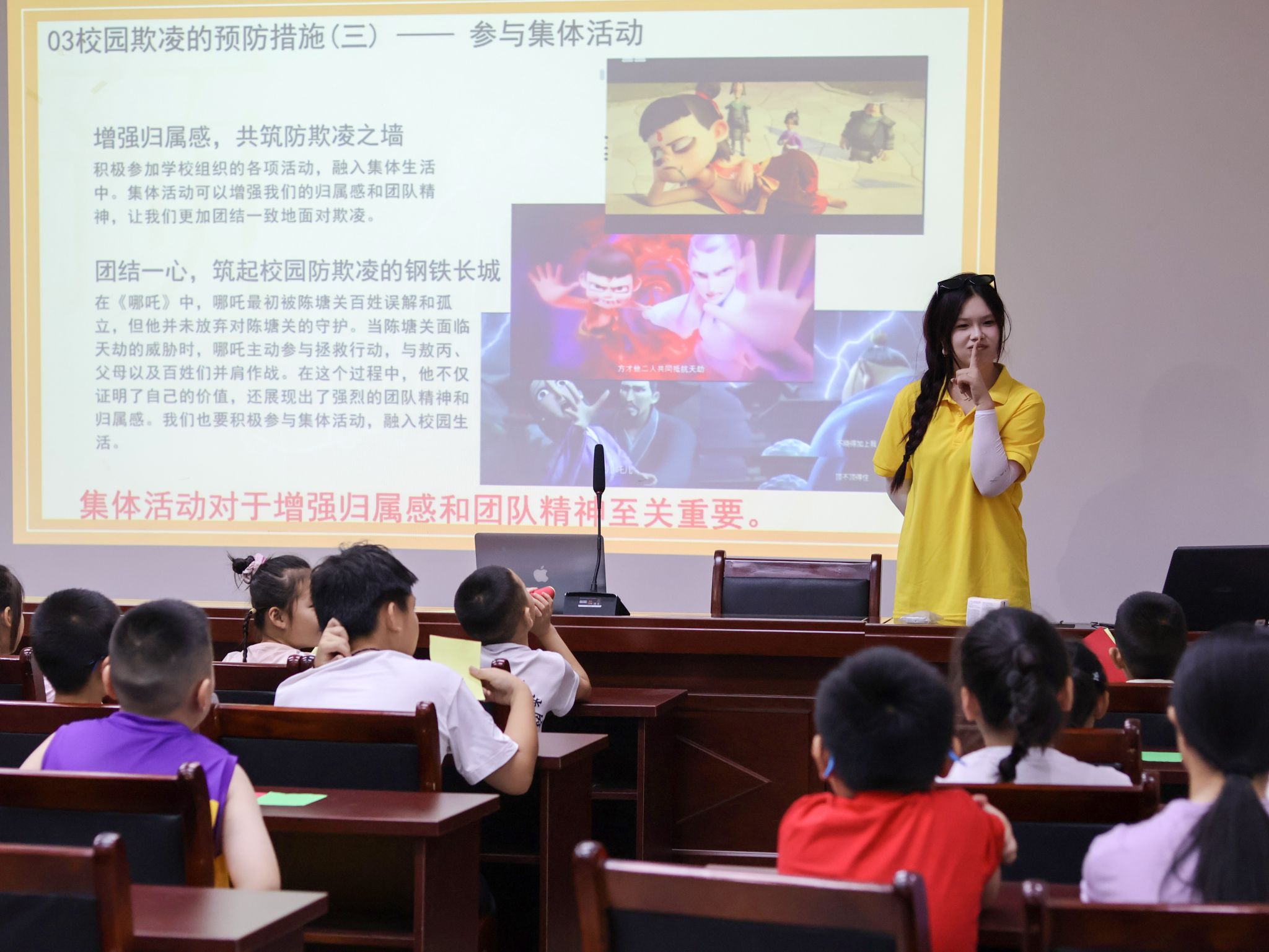 随后,践行团成员王乙童以年度热门电影《哪吒2魔童闹海》为切入点,开启了一场别开生面的安全教育课堂。她将电影中哪吒面对困境勇敢反抗的情节,与校园暴力防范知识相结合,引导孩子们思考,如何应对校园暴力,小朋友们纷纷举手发言。王乙童顺势展开讲解,详细阐述了校园暴力的表现形式、危害以及正确应对方法,教导孩子们学会勇敢对校园暴力说“不”。