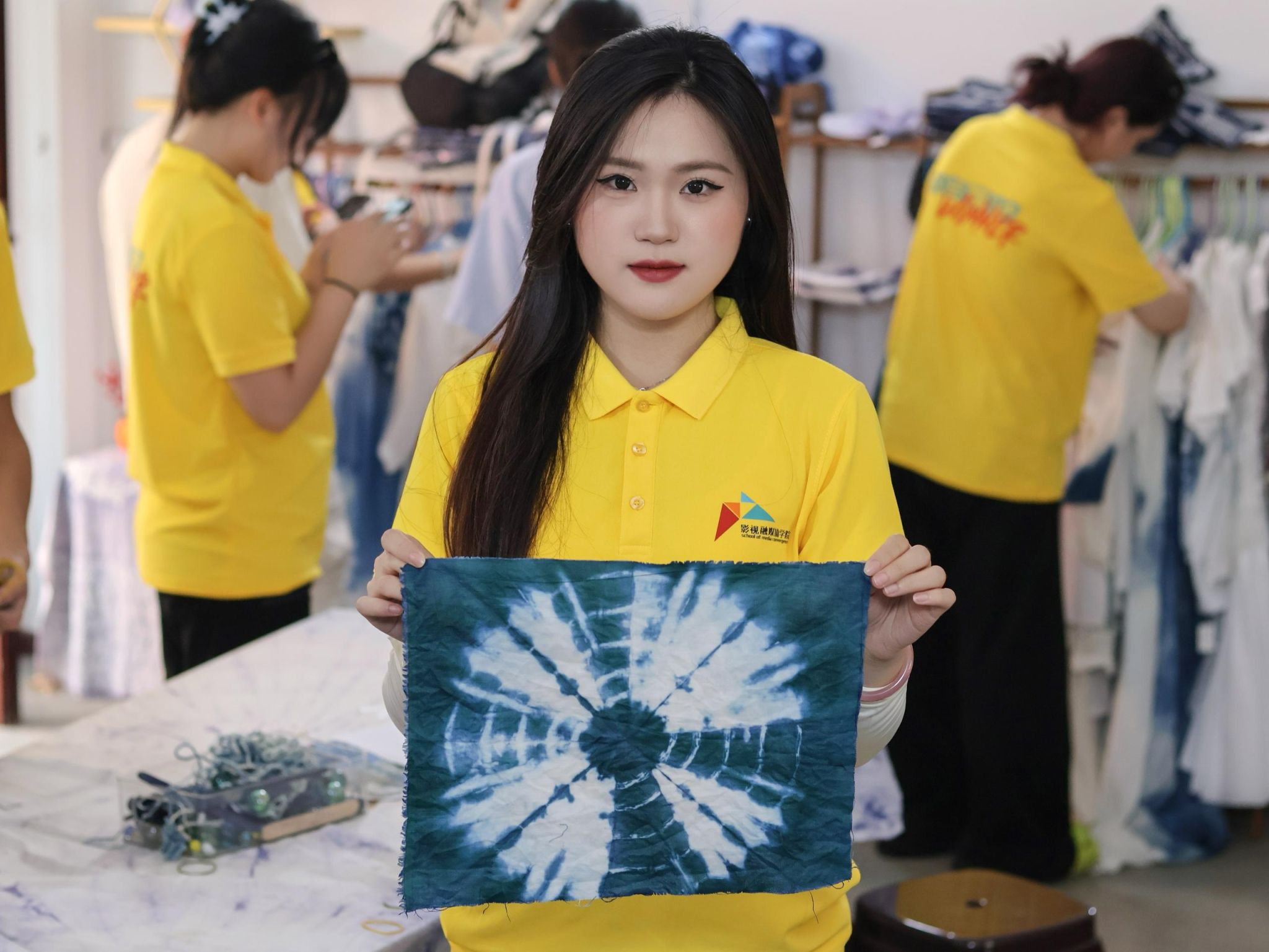 实践环节成了最生动的课堂。冉媛老师还现场演示了扎染的制作过程。她熟练地将布料扎成各种图案,然后浸入染缸中。经过一段时间的染色后,布料被取出晾干,精美的扎染作品呈现在大家眼前。成员们被这神奇的技艺深深吸引,纷纷尝试动手制作。成员们拿起棉线,在冉媛指导下将白布扎出千奇百怪的形状。当浸过靛蓝染液的布料被解开,原本平整的白布上绽放出蓝白交织的花纹,践行团成员彭丽感慨“原来传统手艺这么有互动感”。