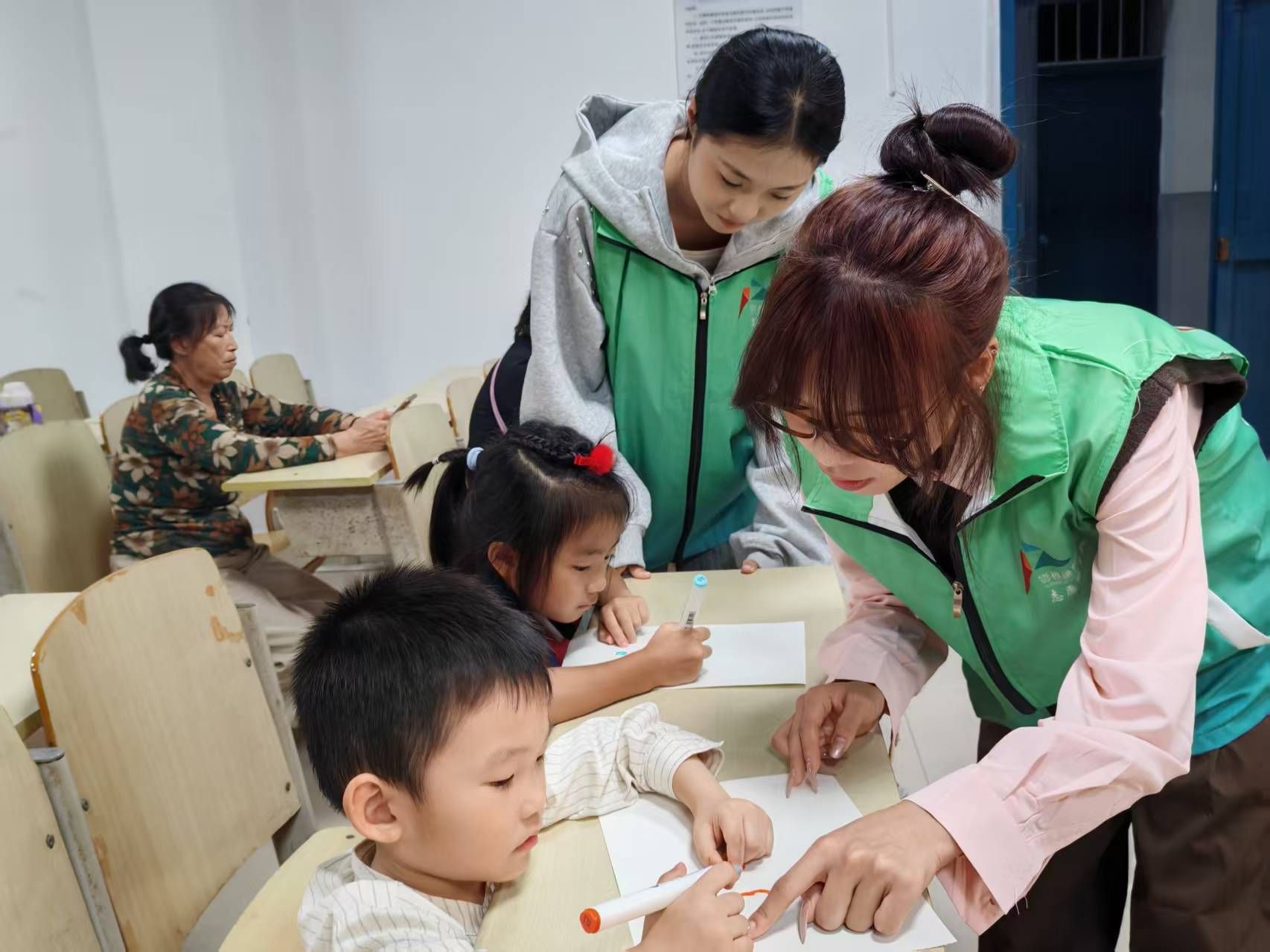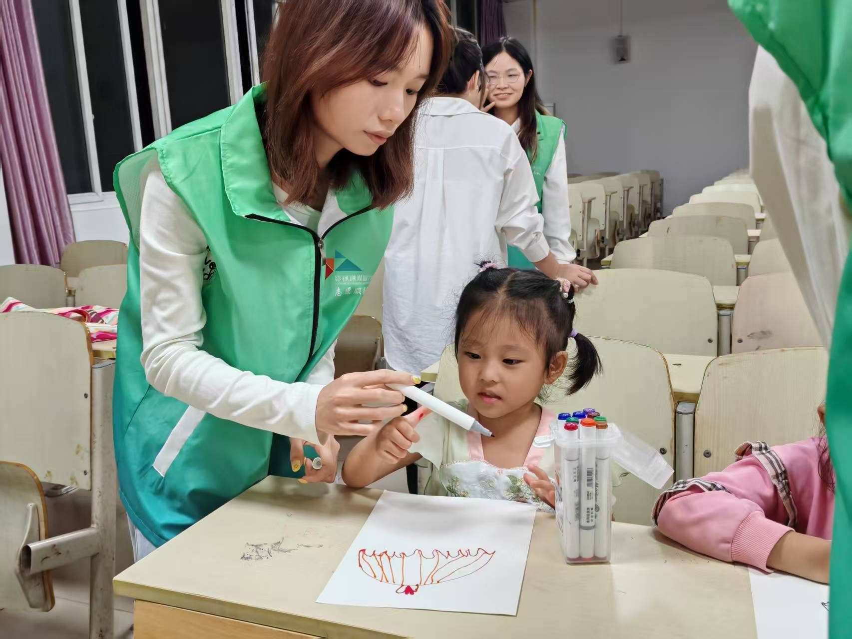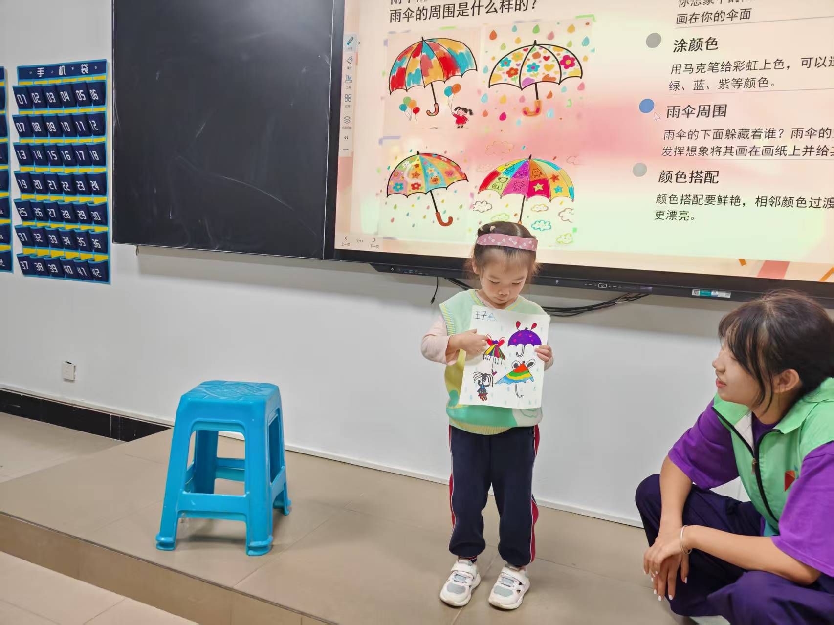 志愿者老师站在讲台上,向小朋友们讲述“小雨滴和彩虹雨伞”的故事,引导孩子们进入情境。给孩子们介绍绘画工具,和孩子们一起认识马克笔和画纸,详细地为孩子们讲述绘画步骤,鼓励他们发挥想象力,在作品中添加小雨滴、云朵、小动物等元素。老师给孩子展示了自己的作品,得到了小朋友的喜爱。