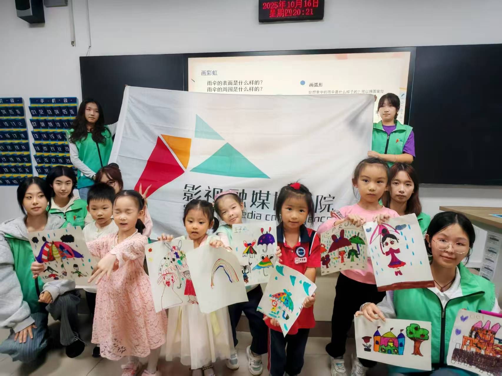 为引导幼儿认识彩虹的七种颜色,感受色彩变化的美,通过绘画“彩虹雨伞”,激发想象力与创造力,培养幼儿的动手能力与色彩搭配能力。学院的8名志愿者同学于10月16日在A3315和6位教职工子女小朋友开展“彩虹雨伞画之旅”主题活动。