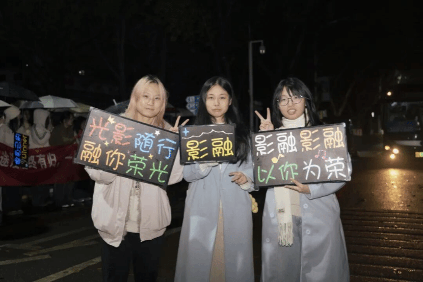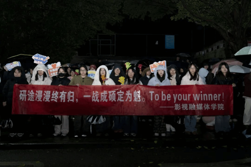 清晨的校园寒意袭人,但助威现场却热情涌动。学院的同学们早早集结在学校东门,他们手持精心设计、闪烁温暖的“影融”专属灯牌,拉起写有“研途漫漫终有归,一战成硕定为魁”的醒目励志横幅,并挥舞着寓意美好的加油手举牌,构成了一道亮丽而鼓舞人心的风景线。